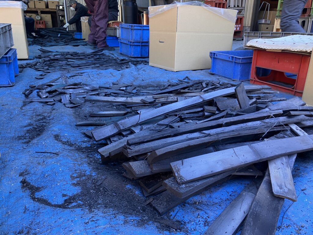 焼け上がった竹炭は割れやすいため、一つひとつ丁寧に、細心の注意を払って取り出すことが欠かせません。その後、炭の形状や焼き上がりの状態を一つひとつ確認し、用途に応じて選別を行います。選別された炭は、製品として仕上げるための加工作業へと進んでいきます。