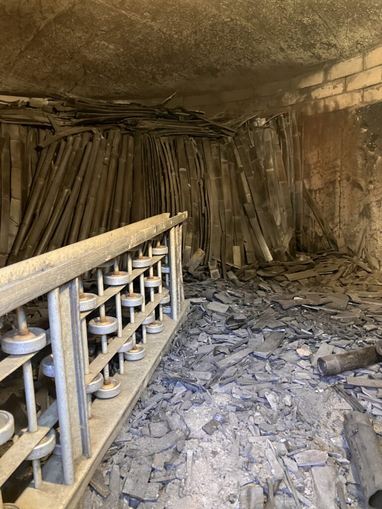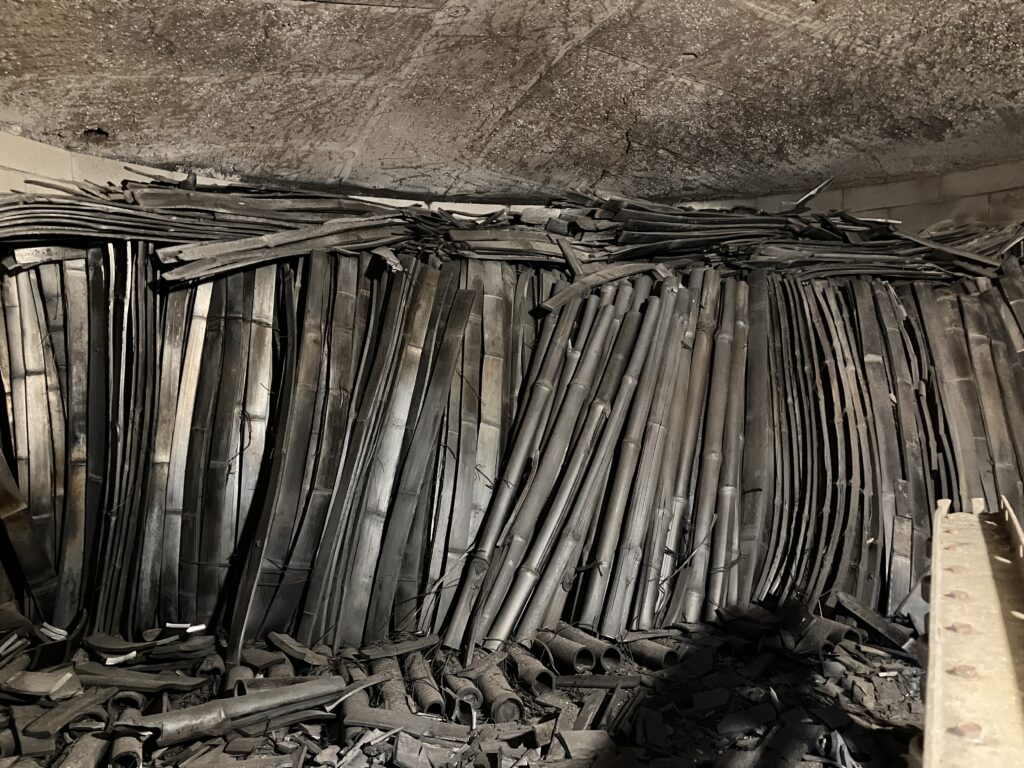 一方、炭をすべて取り出した窯は、次の炭づくりに備えて内部をきれいに清掃しました。準備が整った後、次に火入れを行うための竹を窯の中へと入れていきます。この工程もまた、非常に神経を使う作業です。